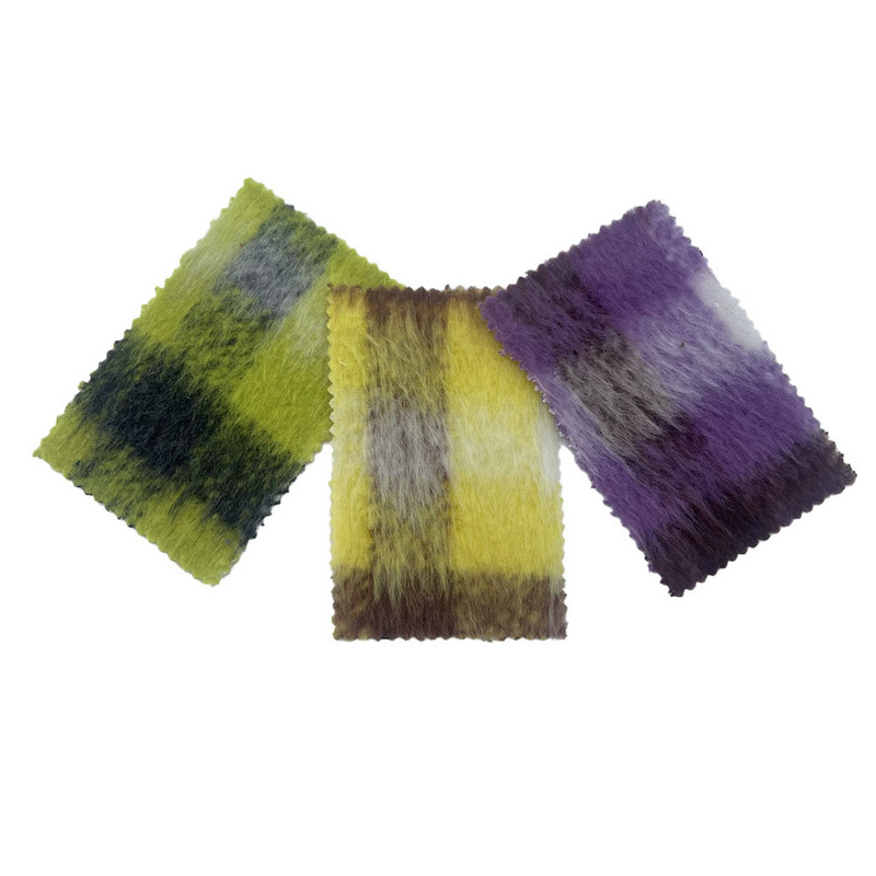 품목 3256으로 지정된 이 직물은 양모 20%와 기타 섬유 80%로 구성된 트위드 직물입니다. 단위 면적당 질량이 700g/m로 중량급 구조를 나타냅니다. 보라색 표면은 격자 무늬 패턴과 긴 파일 질감이 결합되어 특수한 직조 및 마감 공정을 통해 복합 구조를 만들어냅니다. 이 제조 기술은 표면의 섬유 길이를 늘려 뚜렷한 3차원 효과를 만들어냅니다. 울 혼방 구성은 직물의 단열 특성과 구조적 탄력성에 기여합니다. 이러한 기술적 특성으로 인해 상당한 양과 표면 깊이를 지닌 소재가 탄생하며, 높은 보온성과 질감이 요구되는 오버코트에 적용할 수 있습니다.
