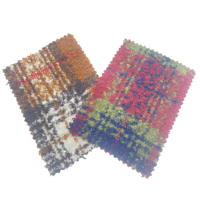 품목 3851로 지정된 이 직물은 울 10%와 기타 섬유 90%로 구성된 자카드 트위드 직물입니다. 단위 면적당 질량이 520g/m로 중~중량급 구조를 나타냅니다. 표면은 자카드 직조 과정을 통해 만들어진 타탄 체크 무늬 패턴으로, 컬러 스트라이프의 정확한 교차점을 형성합니다. 브러싱 마감을 적용하여 테디와 같은 질감을 연출하고 원단의 표면 특성을 변화시켰습니다. 이 기술을 사용하면 시각적 깊이와 촉각 특성을 모두 수정하는 조밀하고 짧은 파일 표면이 생성됩니다. 기술 사양에 따라 이 원단은 정의된 패턴 연결과 독특한 표면 질감이 필요한 재킷 제조에 적용 가능합니다.